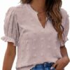 - Features:This chiffon blouses for women adds a variety of fashion elements to traditional shirt, like Puff Shoulder, Swiss Dot, Ruffle Sleeve, and Chic V Neckline; making this short sleeve business tops for women look elegant, but with a touch of cuteness.