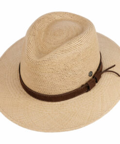 Raffia straw is the material of choice for this trilby, which has a chunkier texture and is light and airy for the summer. The natural-looking plain colour is given a jaunty touch by the brim that stands up boldly at the back, the dented crown and the striped grosgrain ribbon trim band, which casually complements outfits on holiday and at home.