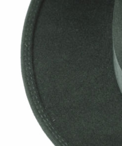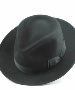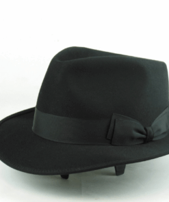 5 1/4″ open crown with teardrop crease. 1 1/2″ black ribbon with double pleated double bow. 2 1/2″ snap brim with over welted edge and double stitch detail.