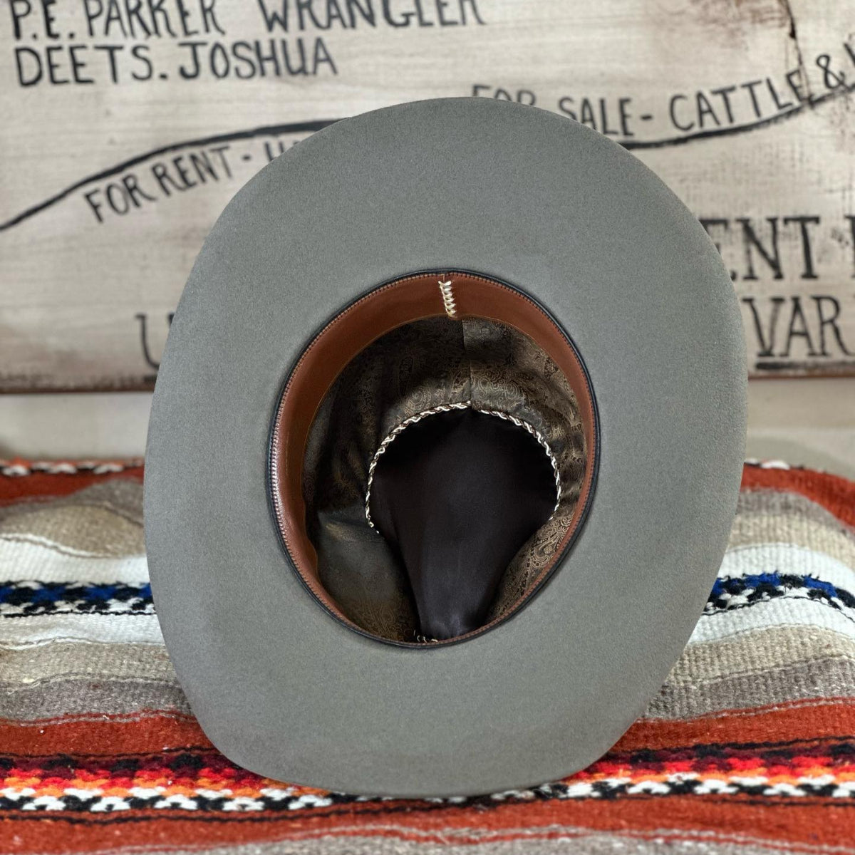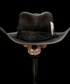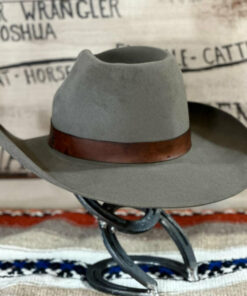 It has a low profile Gus creased crown that is 4.75″ in the back and slopes to 4.25″ in the front. The 3.75″ brim has a small pencil curl on the sides and a nice slope in the front and back. It is topped off with an antique looking leather hat band. We really like this one with its unique look and versatility.